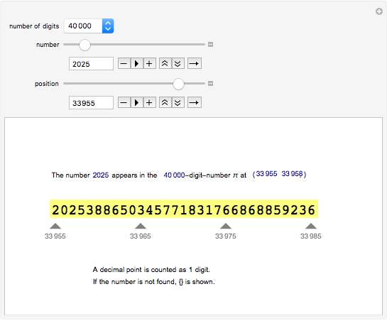 pi2 Where does the 4-digit number 2025, the year of Osaka EXPO appear in the 10-thousand-digit number π? The number 2025 does not appear in the 10-thousand-digit of π. It appears first at the 33 955th digit! Click here to get Mathematica CDF file.